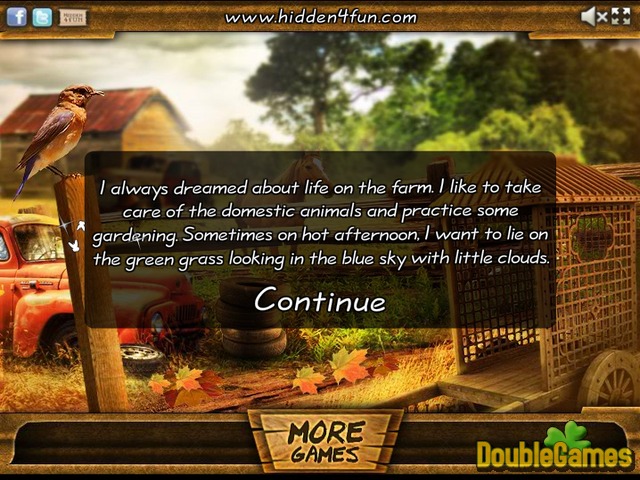 Afternoon At The Farm to całkiem nowa zabawna gra ukryte obiekty, której nie trzeba pobierać. Udaj się na farmę i rozluźnij, a to będzie bardzo ciekawe. Z dala od cywilizacji poczujesz się zupełnie inaczej. Oddychaj świeżym powietrzem i ciesz się przyrodą. By ulepszyć swoje umiejętności znajdź też parę ukrytych przedmiotów. Znajdź je wszystkie i poznaj zakończenie całej opowieści. Zagraj w Afternoon At The Farm już teraz, online i baw się dobrze!