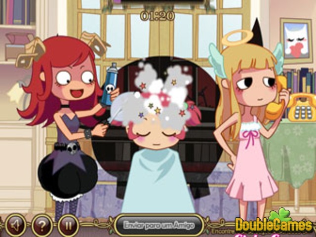 Poznaj nową, zabawną, diabelską grę i rozkoszuj się jej śmieszną fabułą i niezapomnianymi postaciami! Devilish Hairdresser jest nową grą przygodową online gdzie spotkacie już znajome postacie – uroczego diabła i pięknego anioła. Pomóż diabłu niszczyć fryzury, które stworzył anioł w swoim zakładzie! Pilnuj czasu i nie daj się złapać! Mijaj jeden poziom za drugim i zdobywaj bonusy. Zagraj w Devilish Hairdresser całkowicie za darmo już teraz, podejmij wyzwanie i baw się dobrze!