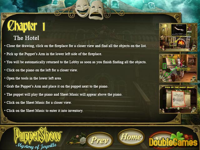 Przewodnik "PuppetShow: Mystery of Joyville Official Strategy Guide" to podręcznik stworzony, aby pomóc Ci rozwiązać trudne łamigłówki w grze. Przeszukaj miasto po wielkim pożarze i odkryj jego przyczynę. Ujawnij sekrety "PuppetShow: Mystery of Joyville" w tej wciągającej grze ukrytych przedmiotów z naszą darmową solucją.